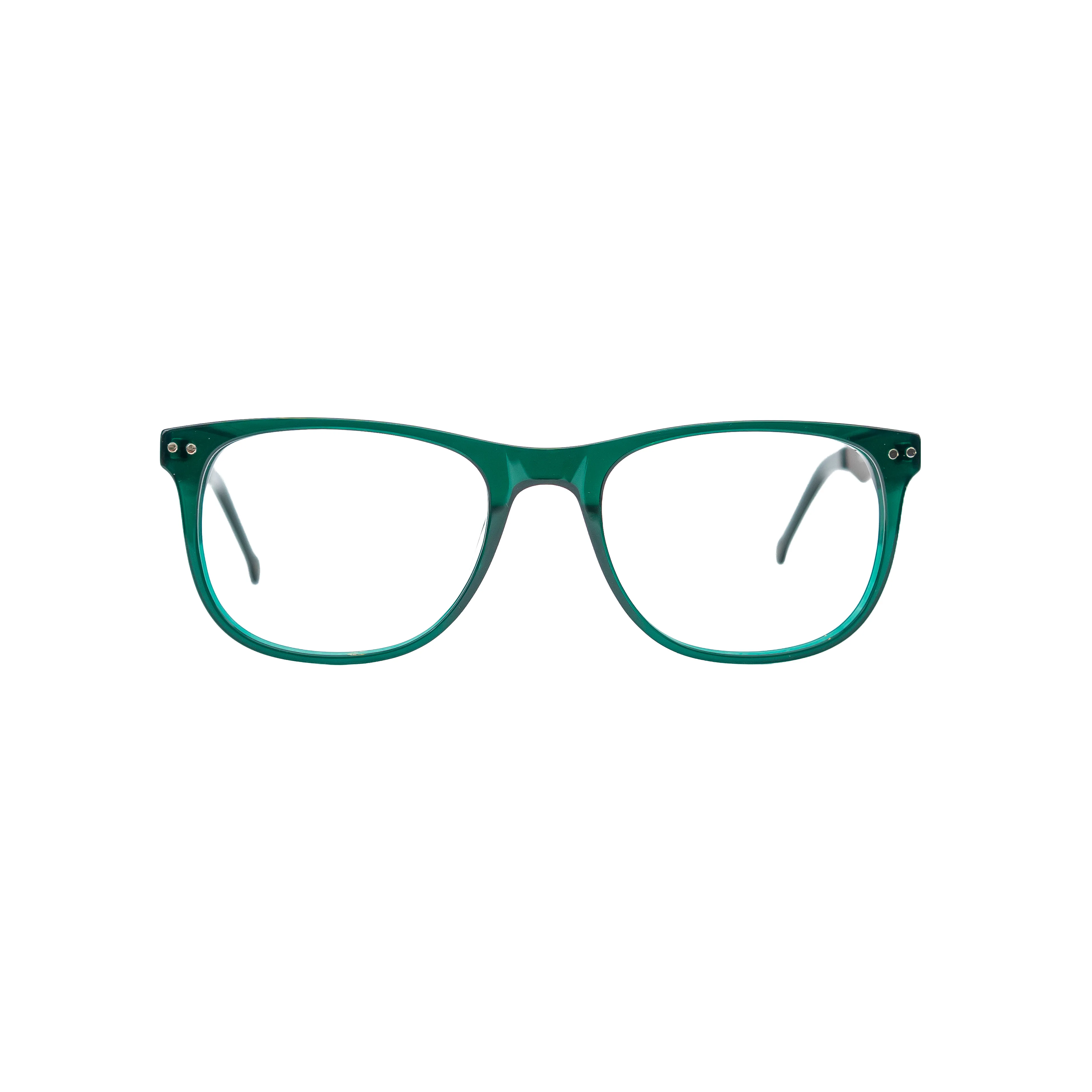 Armazón verde oscuro con frontal de acetato y varillas metálicas.